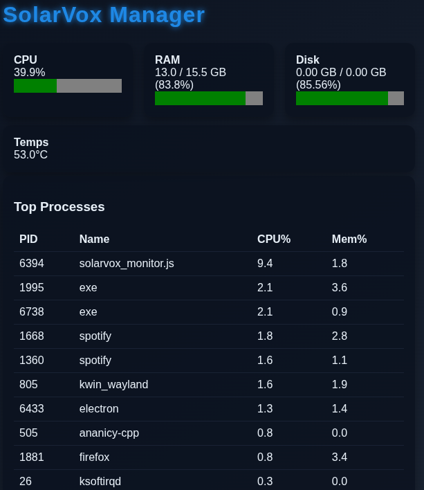 SolarVox Monitor’s purpose is to give users complete visibility over system performance, resource allocation, and runtime behavior — all through a clean and efficient interface.